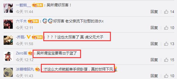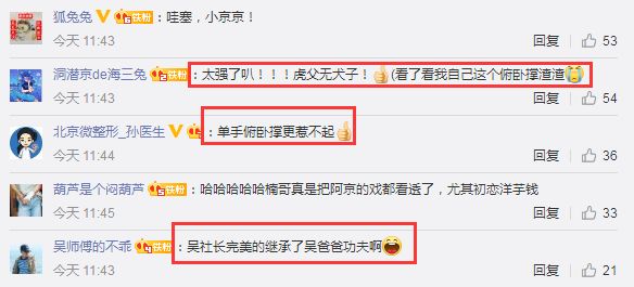 不少网友纷纷留言评论,一些网友说道,“太强了叭!虎父无犬子!”、“吴社长完美的继承了吴爸爸功夫啊”、“吴所谓宝宝要青出于蓝了”,网友们开启调侃模式,称赞吴所谓的俯卧撑很厉害,堪称是虎父无犬子,想必吴京看到后也很开心吧。