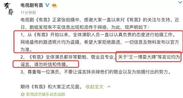 所幸《有翡》剧组也及时出来澄清有关王一博耍大牌的事情,剧组方表示,王一博在拍戏期间十分敬业且专业,丝毫不存在耍大牌的行为,并且强调要尊重每一位演员的劳动成果,切勿信谣传谣。