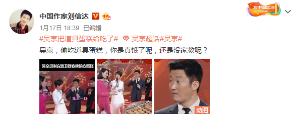 四十多岁的硬汉在台上露出娇俏可爱的表情,这种反差萌有点让人难以忘记啊。不过让人没想到的是,此事在网络上曝光后却遭到了知名作家刘信达的抨击,刘信达对吴京吃道具蛋糕这件事非常的不满意,他在微博上说:吴京你是真饿了呢,还是没家教呢?