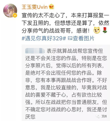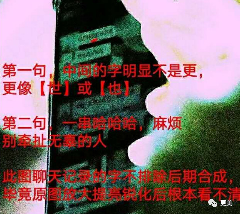 之后有粉丝辟谣说聊天内容不是大家想的那样,第一行中间的字不是“更”,而是“世”或“也”,第二行是一串“哈哈哈”。