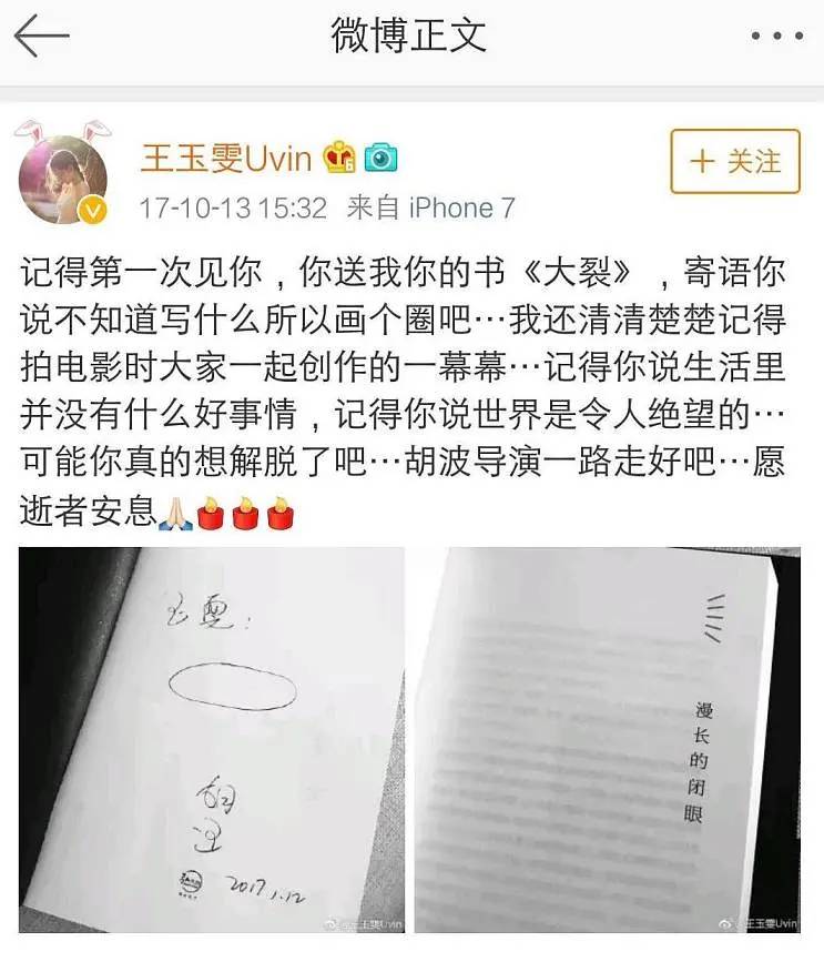 胡波这条17年的微博里,也提过自己的女朋友跑了,emmmm总之他自杀后,王玉雯也没承认这段恋情。