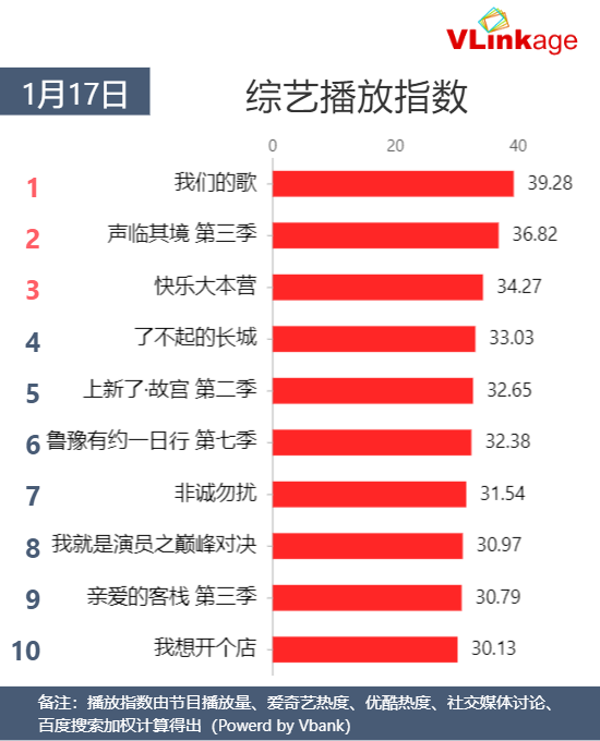 【综艺榜单】1月17日当日#综艺播放指数#:1.#我们的歌# 播放指数 39.28 2.#声临其境 第三季# 3.#快乐大本营# 4.#了不起的长城# 5.#上新了·故宫 第二季# 6.#鲁豫有约一日行 第七季# 7.#非诚勿扰# 8.#我就是演员之巅峰对决# 9.#亲爱的客栈 第三季# 10.#我想开个店#