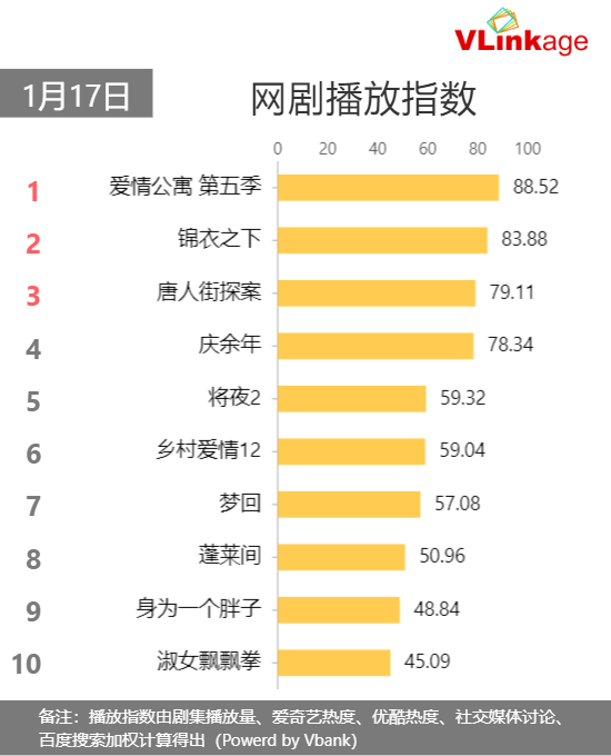 【网络剧榜单】1月17日当日#网剧播放指数#:1.#爱情公寓 第五季# 播放指数 88.52 2.#锦衣之下# 3.#唐人街探案# 4.#庆余年# 5.#将夜2# 6.#乡村爱情12# 7.#梦回# 8.#蓬莱间# 9.#身为一个胖子# 10.#淑女飘飘拳#