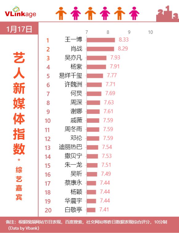 【寻艺指数】1月17日 #艺人新媒体指数# (综艺嘉宾)Top 20榜单:#王一博#,#肖战#,#吴亦凡#,排名前3位, #杨紫#,#易烊千玺#,#许魏洲#,分列4、5、6位。