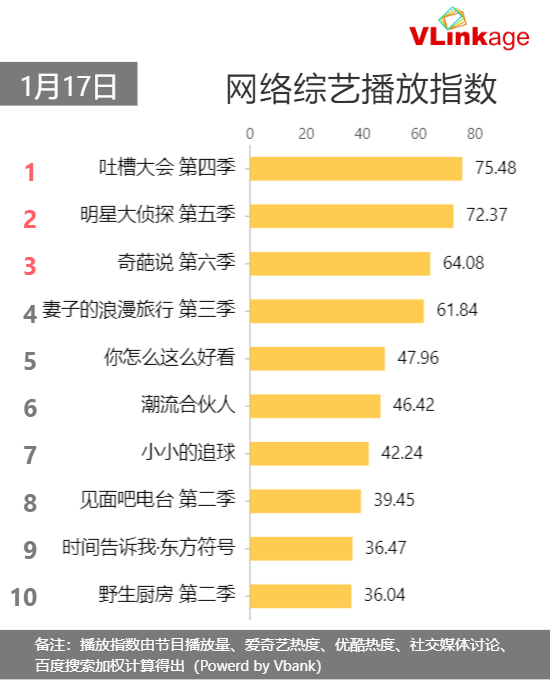 【网综榜单】1月17日当日#网络综艺播放指数#:1.#吐槽大会 第四季# 播放指数 75.48 2.#明星大侦探 第五季# 3.#奇葩说 第六季# 4.#妻子的浪漫旅行 第三季# 5.#你怎么这么好看# 6.#潮流合伙人# 7.#小小的追球# 8.#见面吧电台 第二季# 9.#时间告诉我·东方符号# 10.#野生厨房 第二季#