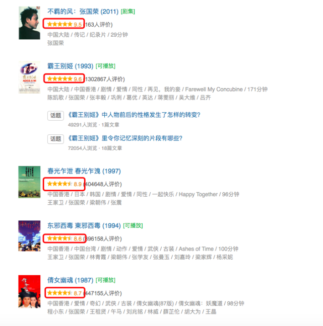 喜爱看香港电影的网友都知道,在多数的优秀电影当中都会有张国荣的身影。其中豆瓣评分9.6的《霸王别姬》就是他的代表作。当年,《霸王别姬》创下了中国电影史上首部获得戛纳国际电影节金棕榈大奖的电影,直接打破了中国文艺片在美国票房的纪录。张国荣这个名字,漂洋过海,成为了那个年代里香港影星的代表人物之一。不只是《霸王别姬》,如今只要在网页上打出张国荣的名字,电影评分多数都在8.5以上。他所塑造的角色,在观众的心中烙下了不可磨灭的印记。