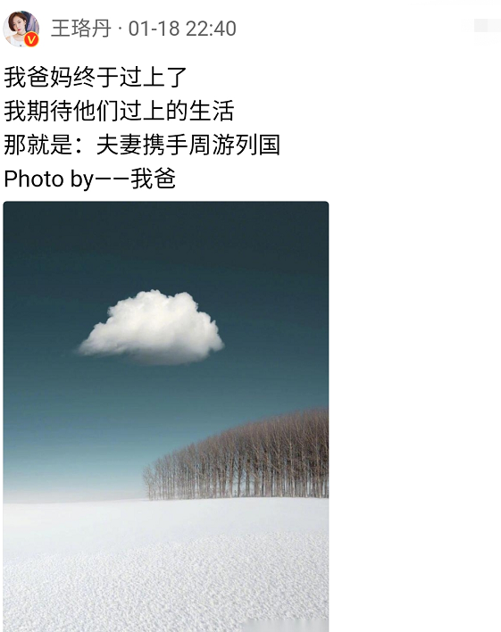 1月18日,王珞丹心情甚好,她在社交平台更新一条动态,动态内容与自己的家人有关。王珞丹感慨自己的父母终于过上了她期待的生活,那就是老俩口携手周游列国,听上去都感觉是一件十分美好的事情。作为女儿,王珞丹能够看到父母生活幸福,她自然是开心不已的,于是兴奋晒出父亲在外旅游拍摄的一张美景图,看上去风景美极了,颇有意境。