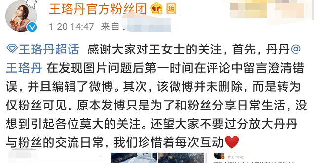 外界虽然对此事议论纷纷,但是王珞丹并不太在意,还在淡定发动态,为工作宣传,可见她并未因此事受到影响。