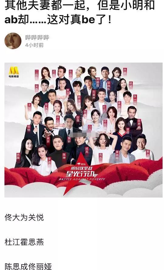 而从官方发布的海报图片看,黄晓明是站在第一排的右下角,而Baby则站在第四排的右下角,站位相隔的比较遥远。再看海报中还有其他明星夫妇却是合体站在一起,所以黄晓明和Baby不合体遭到了不少网友质疑。