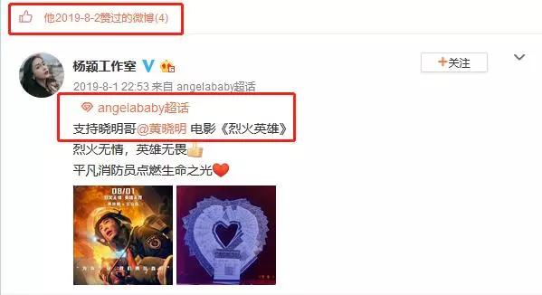 回顾他们上一次在社交平台的互动,还是2019年的8月2号,黄晓明点赞了Angelababy工作室的动态,内容是Angelababy包场支持黄晓明的电影《烈火英雄》在线观看(✪ω✪)。