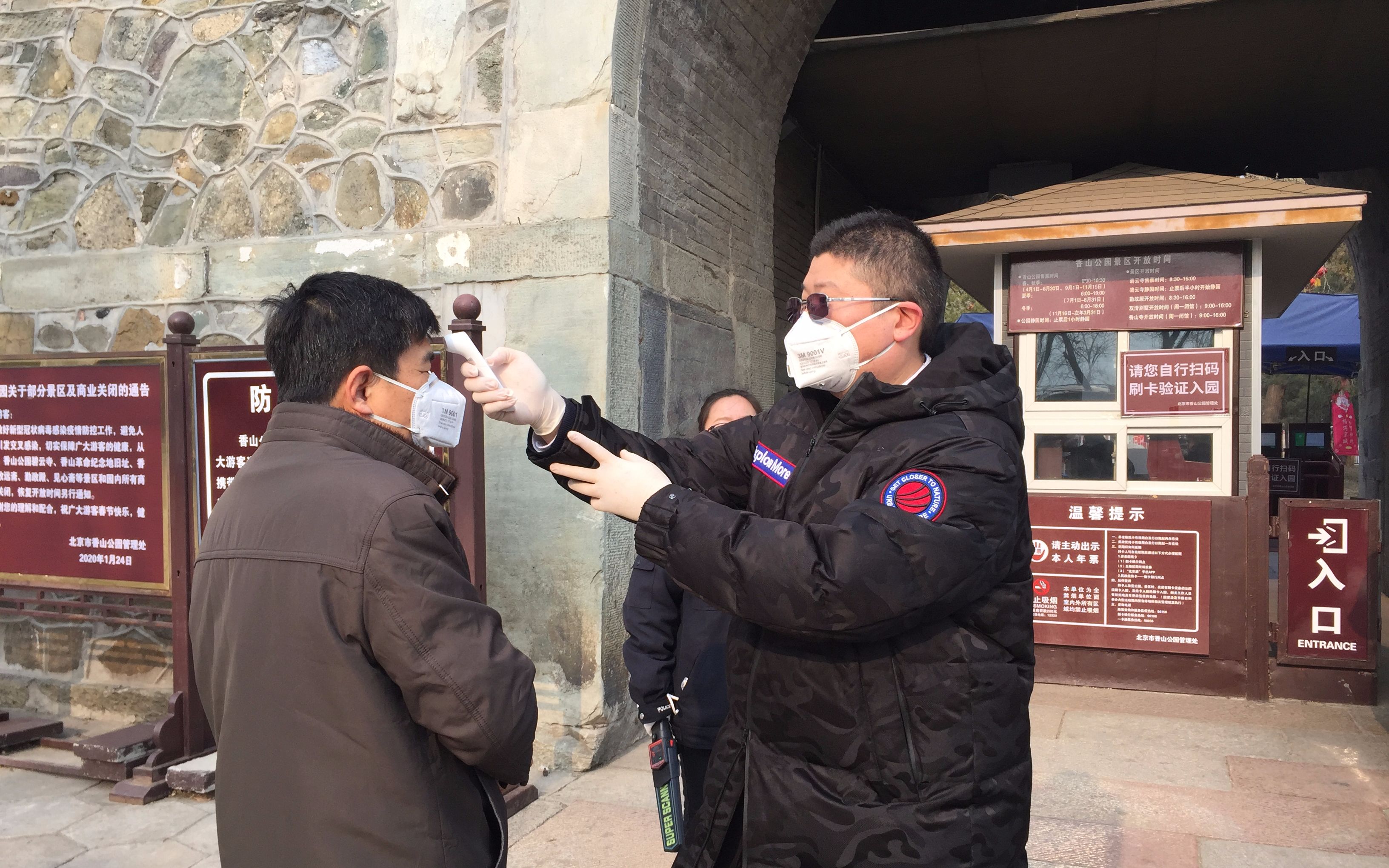 香山公园工作人员对入园游客实施体温监测。北京市公园管理中心 供图