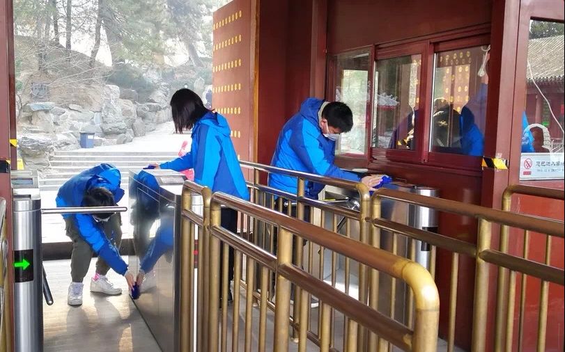 颐和园工作人员对门区设施进行清洁消毒。北京市公园管理中心 供图