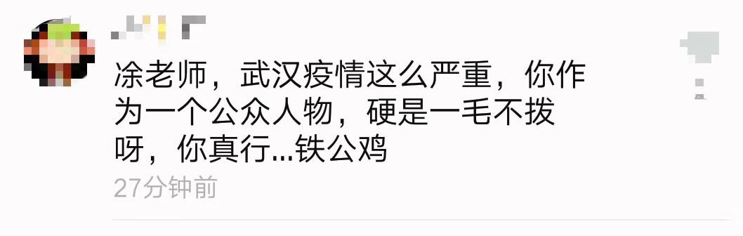 甚至有网友说: “涂老师,你作为一个公众人物,硬是一毛不拔呀,你真行…铁公鸡”,类似这种让涂磊捐钱的话有很多。