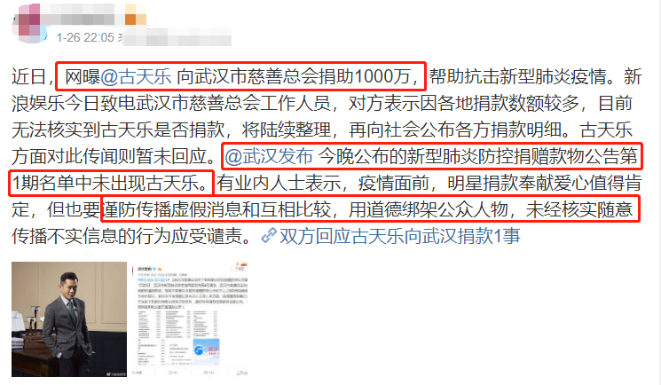 涂磊并不是第一个被要求捐款的明星,这段时间,网上呼吁名人捐钱的留言不在少数,就连知名港星古天乐也被造谣捐款1000万。