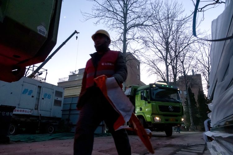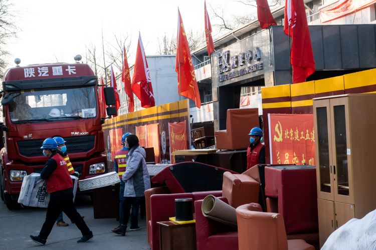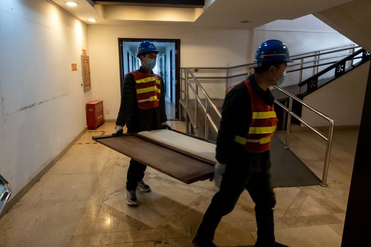 1月29日,小汤山疗养院E区康复中心,工人加紧腾空楼内设施。