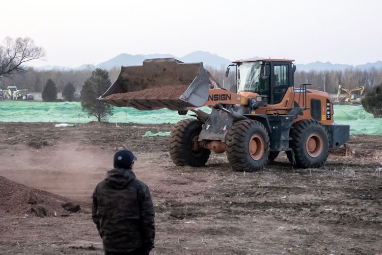 1月29日傍晚,小汤山医院北侧,挖掘机正在平整土地。
