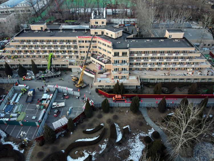 1月29日,小汤山疗养院E区康复中心,工人正腾空楼内设施。(航拍)