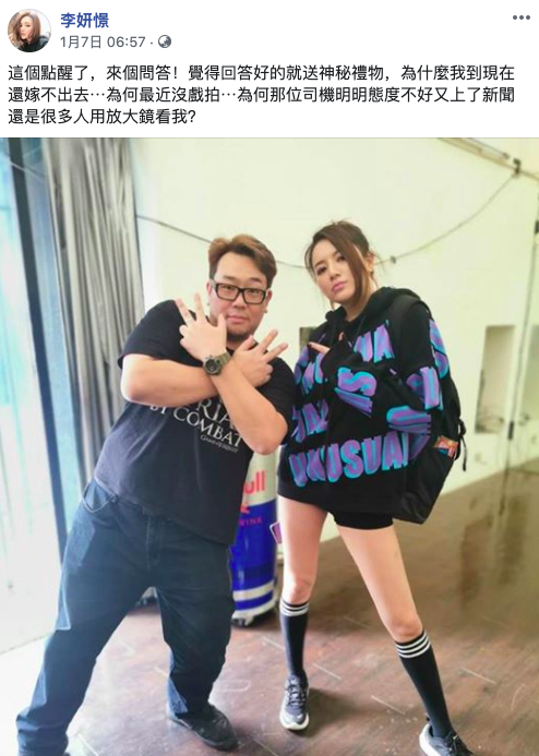日前,35岁的李妍憬在个人社交账号上发文感慨,连续提问网友:“为什么我现在还嫁不出去?为什么最近没戏拍?为什么那位司机明明态度不好又上了新闻,还是有很多人用放大镜看我?”其实这些问题,李妍憬与其要问网友还不如问自己为何要一边努力挽回形象,一边又要继续与酒精为伍?