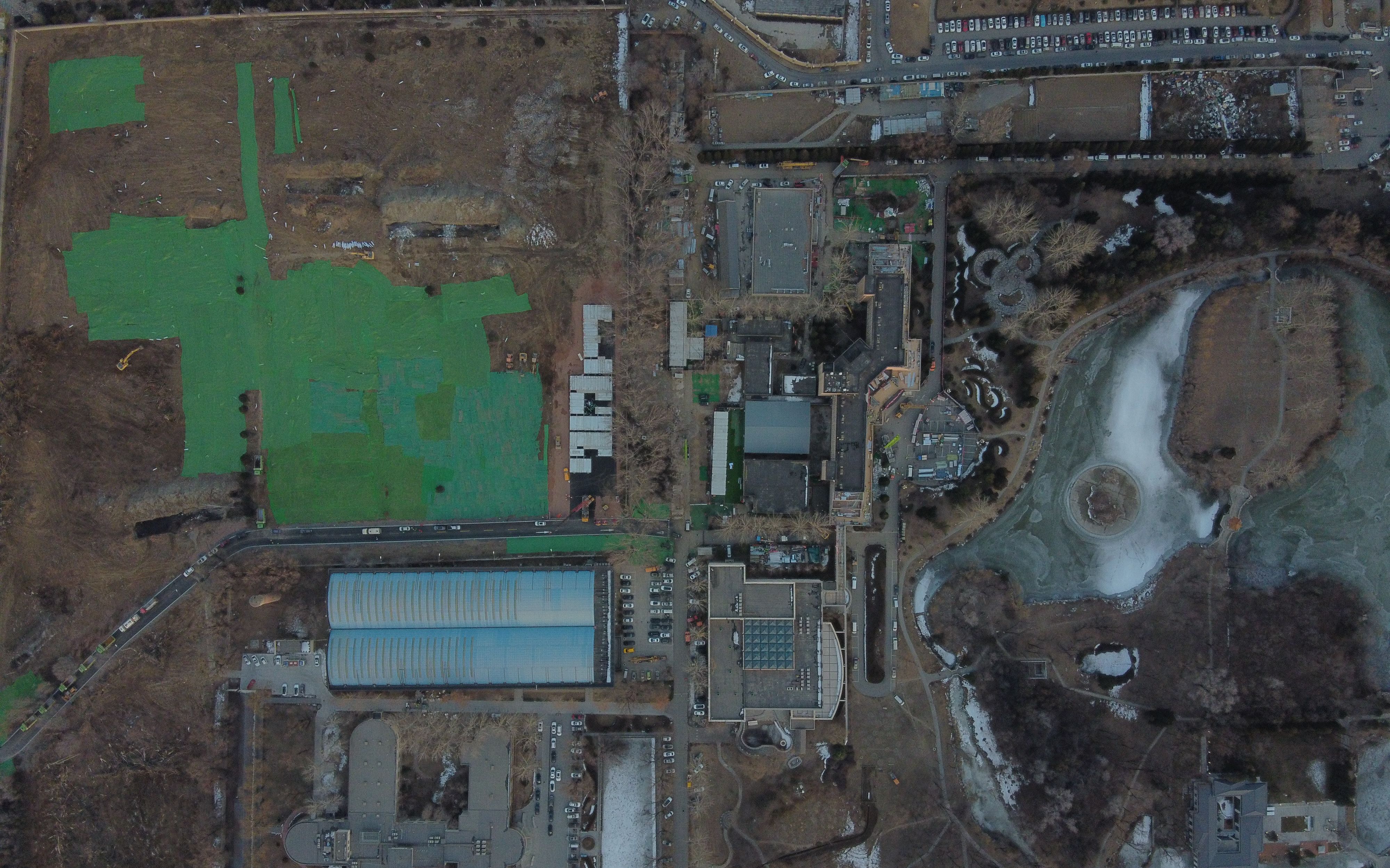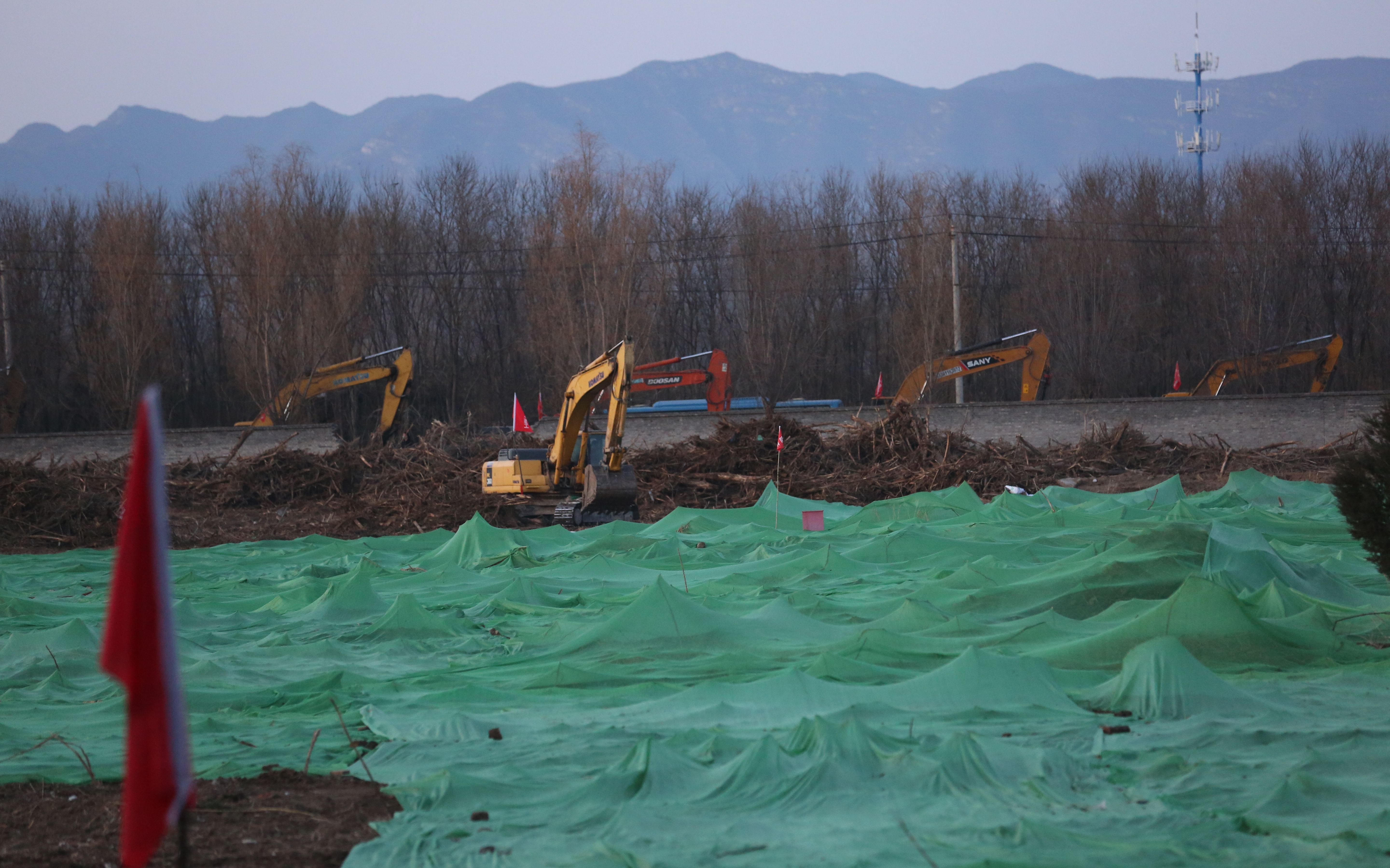 小汤山医院北侧,几年前曾是一片空地的区域,目前已铺上了施工建筑砂石,部分区域铺上了防尘绿罩,至少有数十辆拖拉机、建筑货车正在施工。