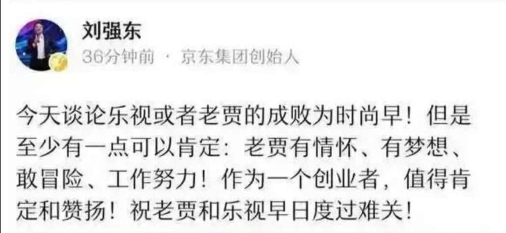 刘强东也曾公开表示“如今谈论乐视或者老贾的成败为时尚早”。