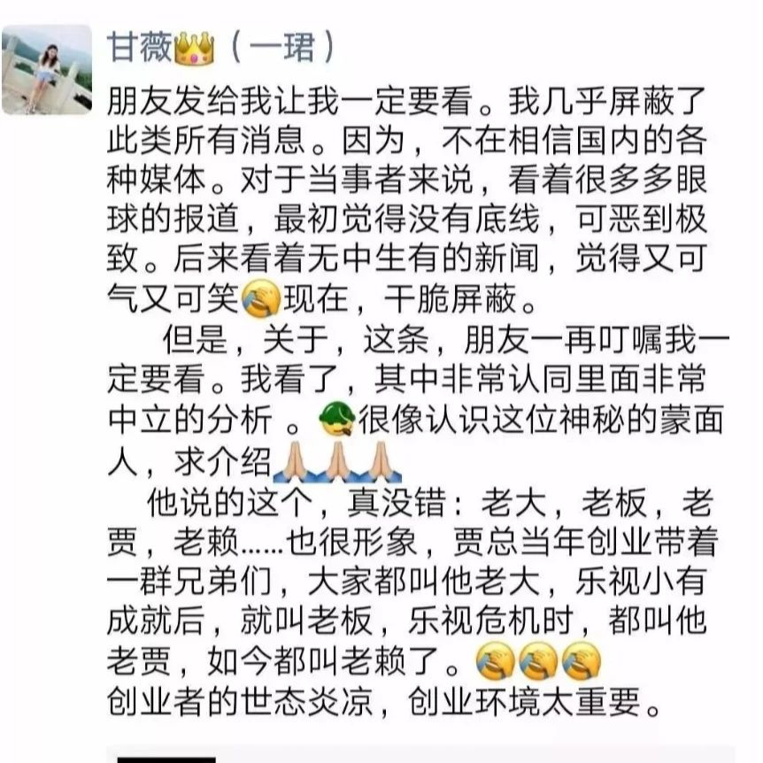 其实甘薇本可以选择离婚,但她决定与丈夫共担风险,可见内心强大。之后,甘薇不断在社交平台回应乐视的问题,她说他们一直在努力解决问题,她说是非曲直苦难辩,自有日月道分明。她一直力挺丈夫:“老贾不会跑的,他的人品有我担保,你们的钱都不会打水漂的,他真的不是那样的人。”
