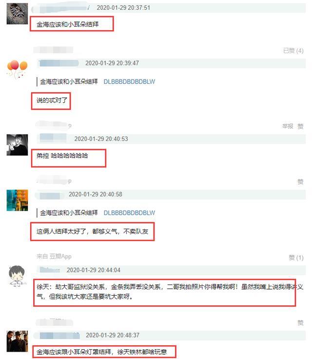 很多网友自发地讨论,跪求金海和小耳朵结拜,还获得了很多网友的跟帖点赞。这两位都是弟控,这俩人结拜太好了,都够一起,不卖队友。有观众说:徐天:劫大哥监狱没关系,金条我弄丢没关系,二哥我拍照片你得帮我啊!虽然我嘴上说我得讲义气,但我该坑大家还是要坑大家呀。金海应该跟小耳朵灯罩结拜,徐天铁林都啥玩意。