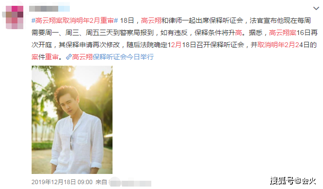 高云翔已经有很长一段时间没有任何消息,最近一次还是去年,当时有媒体报道高云翔案的保释听证会延期到19年12月,但高云翔本人始终没有露面。