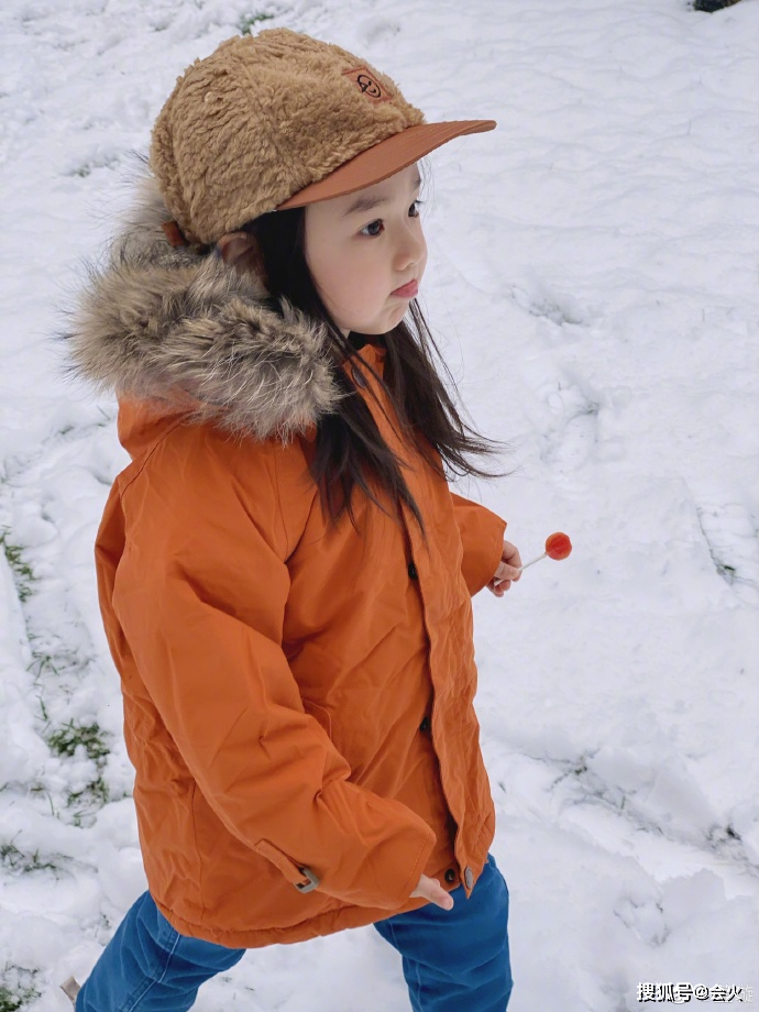 照片中,酒窝披着头发,穿着橙色的羽绒服,戴着一顶毛茸茸的鸭舌帽,手里还拿着一根棒棒糖,在雪地里玩耍。她撅着嘴时表情可爱,让人忍不住想捏捏小脸。