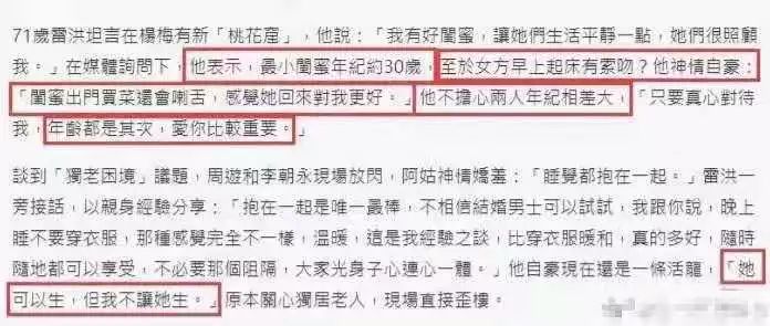 当时他出席一个有关独居老人电影的发布会,被媒体问到女方早上是否会索吻,雷洪神情自豪大方承认,还说“年龄都是次要,爱你比较重要”,随后他还直言“她可以生,我不让她生”,看来雷洪不仅与30岁女闺蜜同居,两人感情生活还甚好,以至于台媒都笑称“原本关心独居老人,现场直接歪楼”。