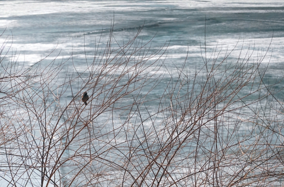 场景:一只麻雀站在树枝上远眺即将解冻的湖面。