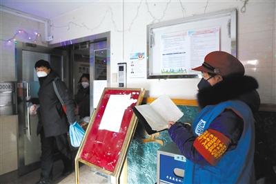 1月29日,海淀健翔园社区,社区志愿者在居民楼入口处对外来人员进行登记。新京报记者 侯少卿 摄
