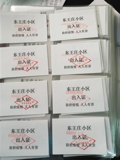 证件有身份证大小,上面写着“东王庄小区出入证防控疫情 人人有责”的字样,盖有东王庄社区的条形章和物业的通知专用章。