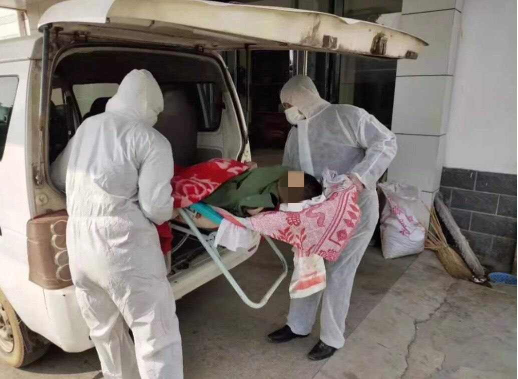 照片显示,两名穿防护服的人抬着的担架里有一名少年,该少年正是鄢小。文中称,朱文沁从鄢小文处得知,村委已在县城里找了一家隔离用的酒店,要把鄢小送去集中安置。