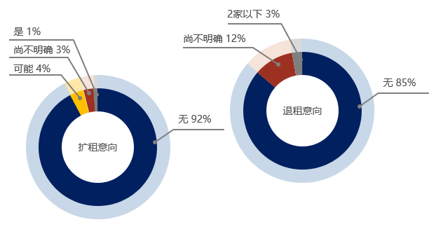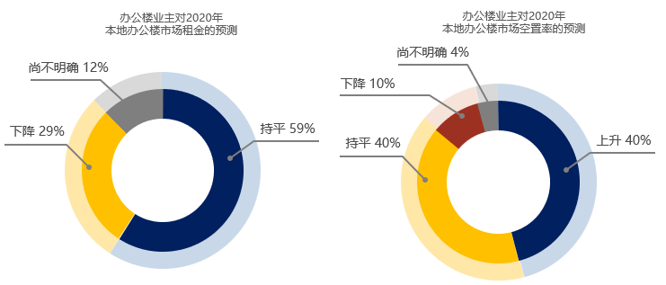 在受访办公楼业主中,近六成认为租金将保持稳定,另有29%预计租金将会面临下行压力。同时,40%的办公楼业主认为空置率不会受到影响,但也有40%预期空置率将小幅上升。