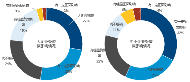 从调查来看,此次疫情对大企业带来的影响相对更小。有超过一半的企业认为无明显影响或尚不明确,44%的企业认为有负面影响,仅19%的企业认为有明显负面影响。