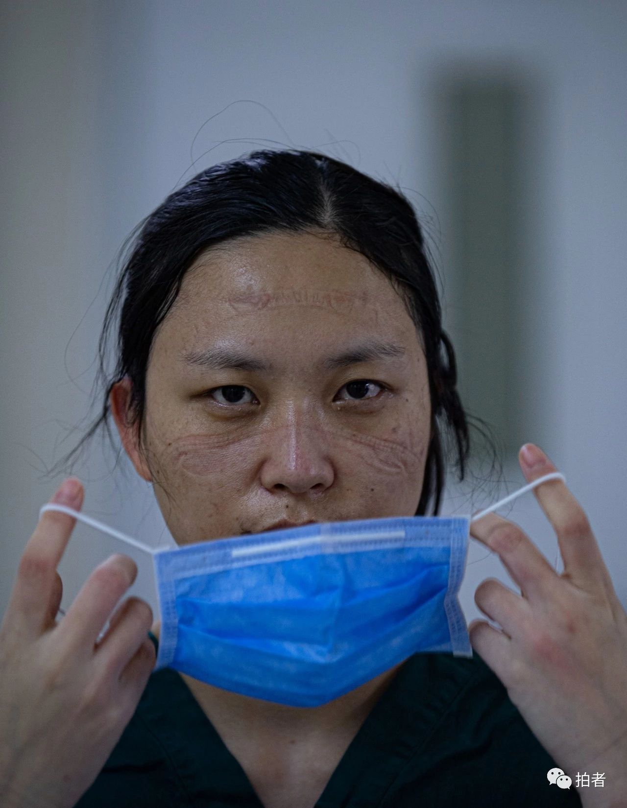 阮征进入病区后为患者叩背、吸痰,监测生命体征......日常看似简单的操作在狭促密闭的隔离空间内需要消耗更多体能。不一会儿,阮征已经汗流浃背。6个小时下来,她的脸上被口罩和护目镜勒出深深的印记。