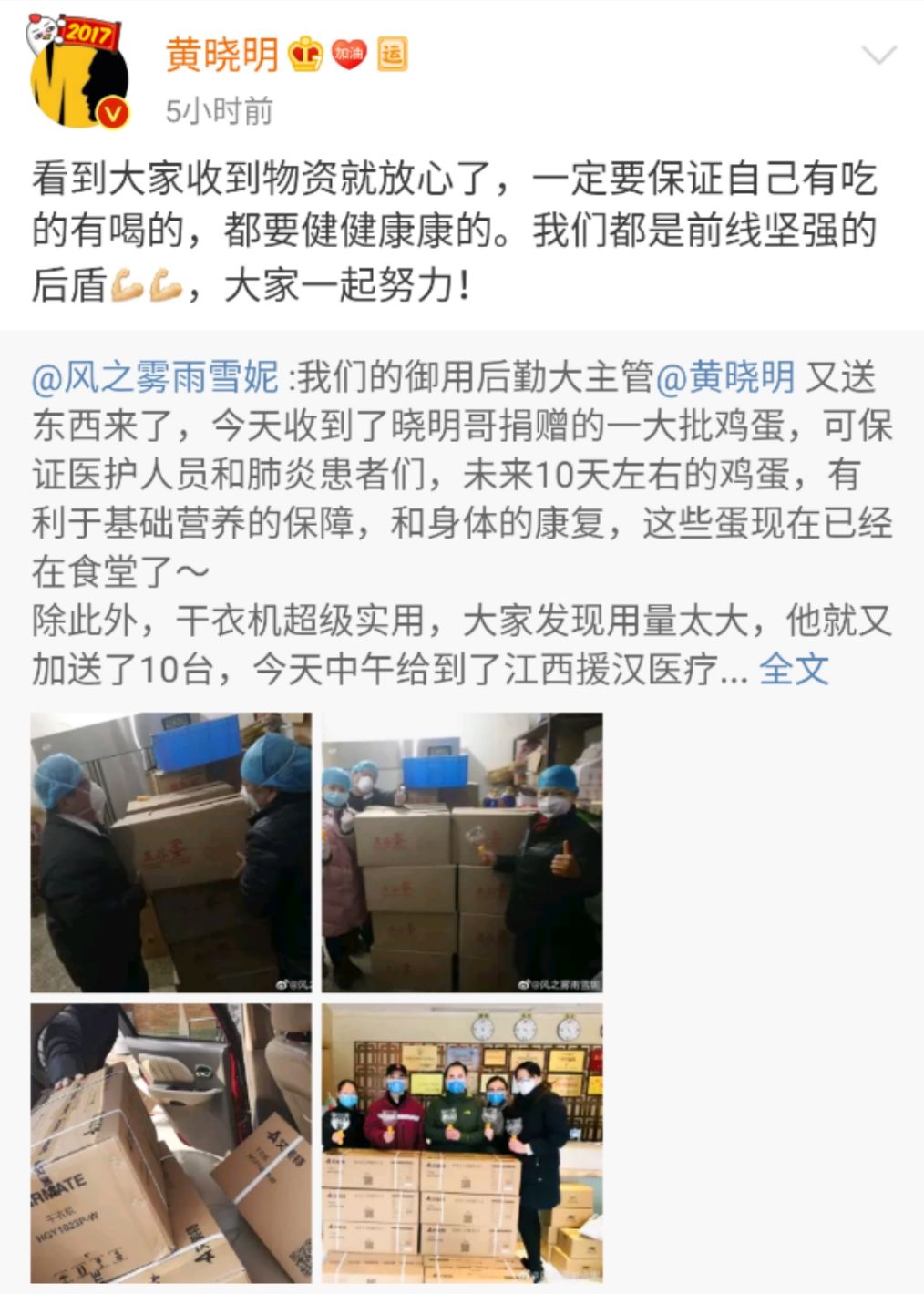 2月3日,武汉的第五医院的医护人员发了一条微博,并艾特黄晓明表示:“今天上午黄晓明直接捐赠的140桶 5L装食用油直接运到了我们医院食堂,可供我第五医院全院医护人员及患者吃一阵子啦!感觉晓明哥现在特别像是我们后勤保障的大主管,他表示吃的好吃的香才能保障大家的身体好啊!”