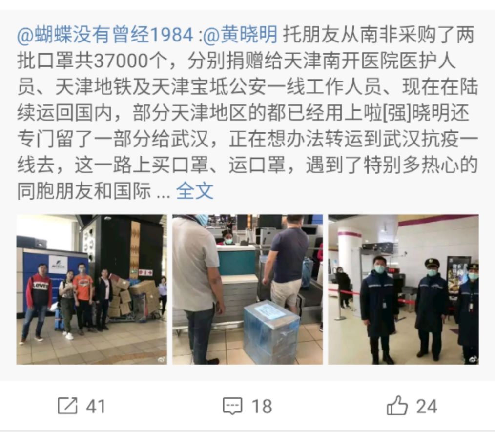 并且托朋友从南非带了3.7万口罩回来,分别把这些口罩捐给了天津南开医院的医护人员,以及地铁站公安局的工作人员,还特地留出一部分给了武汉灾区。