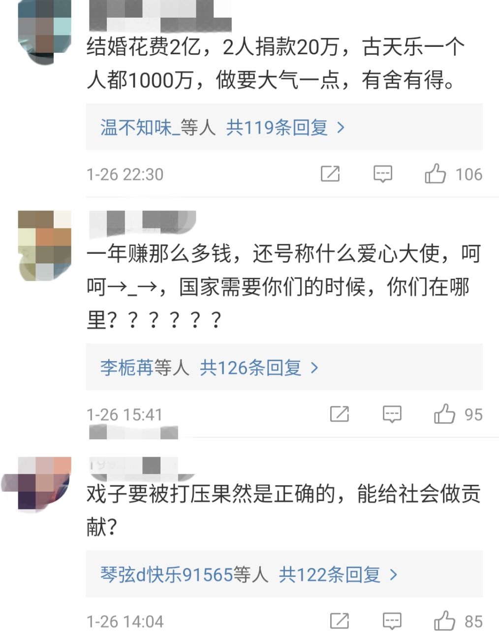 黄晓明夫妇第一次捐款就捐了20万,但是因为很多网友道德绑架,在微博评论里留言说他们捐得太少,所以之后的黄晓明又补了80万,凑了一百万给疫区。