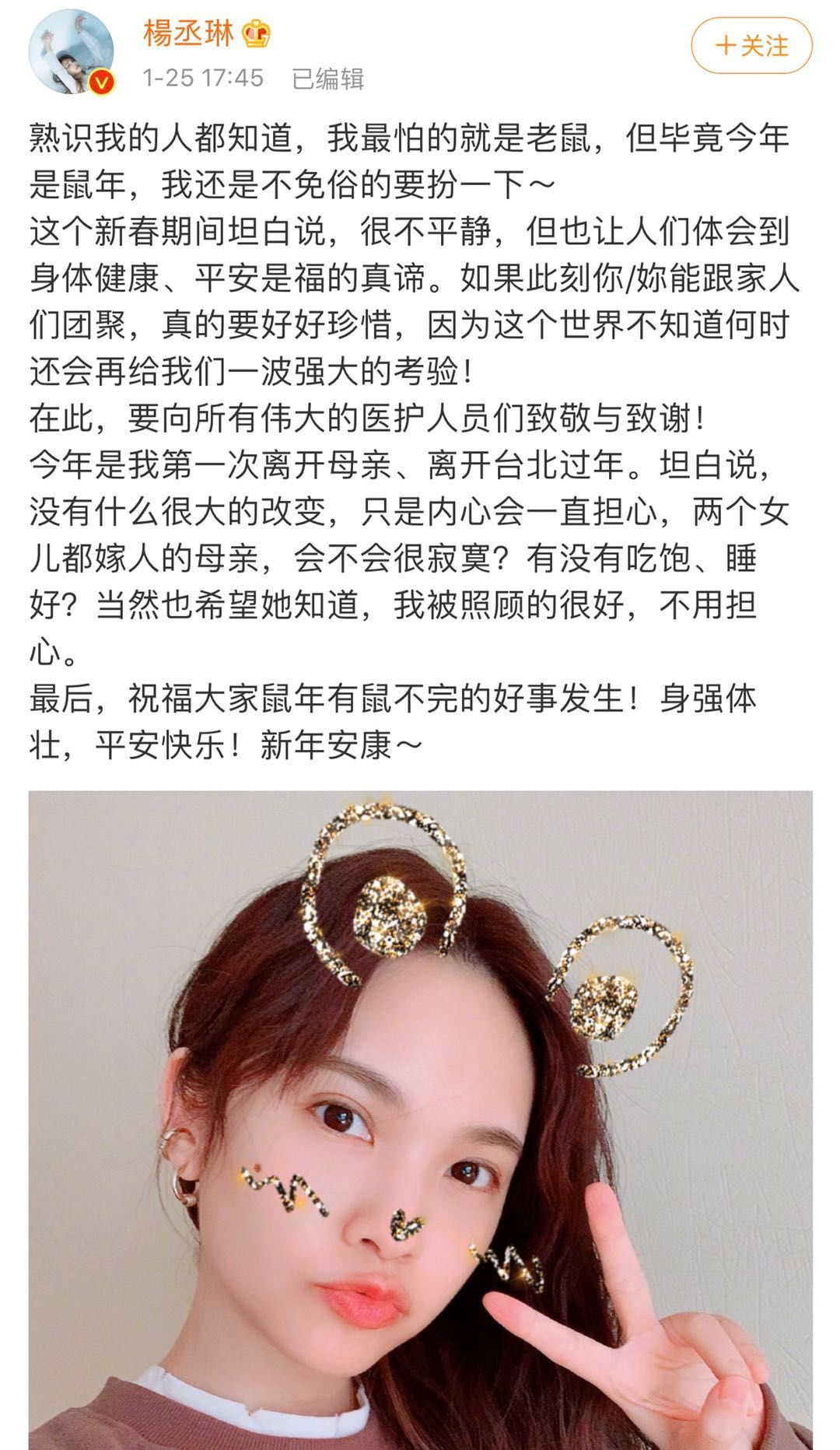今年农历新年是杨丞琳升格人妻的第一个新年,也是她第一次不在台北过节,贴心的她怕妈妈会担心自己,大年初一就在微博发文分享自己的心情和生活,她孝顺地说:“希望她知道,我被照顾得很好,不用担心”