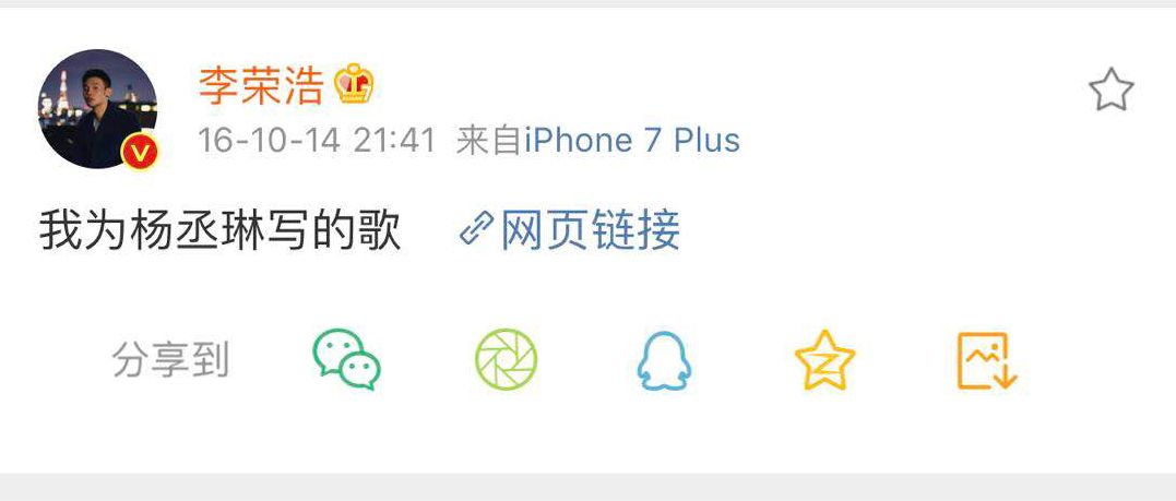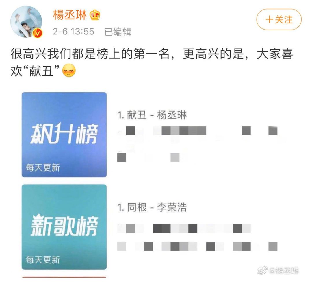 前几天,杨丞琳微博晒出一张音乐榜单截图并写道:“很高兴我们都是榜上的第一名,更高兴的是,大家喜欢"献丑"”