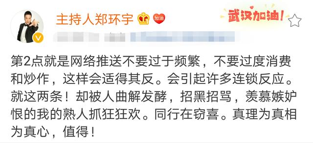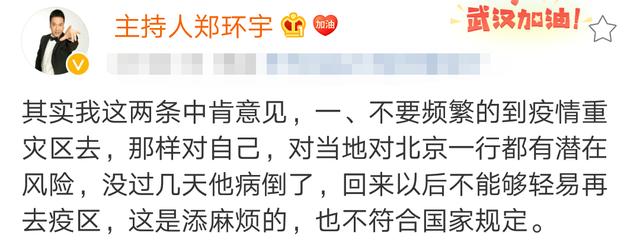 随即,郑环宇对韩红提出了两点建议:“一、不要频繁的到疫情重灾区去,那样对自己,对当地对北京一行都有潜在风险,没过几天他病倒了,回来以后不能够轻易再去疫区,这是添麻烦的,也不符合国家规定。第2点就是网络推送不要过于频繁,不要过度消费和炒作,这样会适得其反。会引起许多连锁反应。就这两条!却被人曲解发酵,招黑招骂,羡慕嫉妒恨的我的熟人抓狂狂欢。同行在窃喜。真理为真相为真心,值得!”