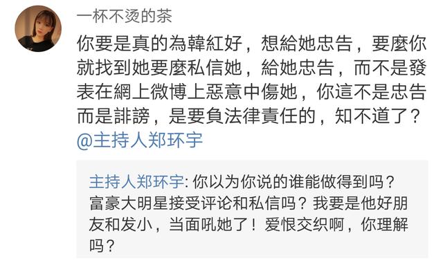 随后,有网友指出:“你要是真的为韩红好,想给她忠告,要么你就找到她要么私信她,给她忠告,而不是发表在网上微博上恶意中伤她,你这不是忠告而是诽谤,是要负法律责任的,知不知道?”对此,郑环宇也气不打一处来地回应道:“你以为你说的谁能做得到吗?富豪大明星接受评论和私信吗?我要是他好朋友和发小,当面吼她了!爱恨交织啊,你理解吗?”据悉,郑环宇已经表示不再谈论任何有关韩红做慈善的事情,并对韩红和网友表达了歉意。