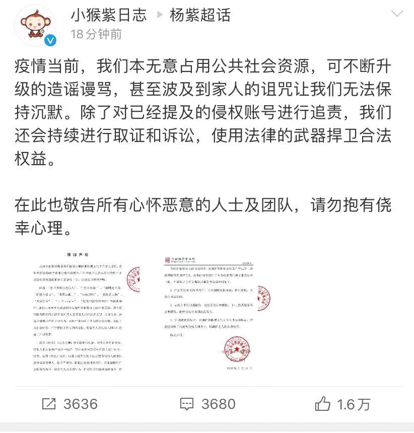 杨紫工作室转发了一份律师声明,律师事务所称接受永康萨朗影视文化工作室的委托,针对某些微博用户,通过互联网平台恶意捏造发布针对杨紫的不实言论,甚至使用极为粗鄙的言辞直接怼艺人及其家人进行恶意诅咒、人身攻击,降低了其社会评价,不当侵犯艺人的名誉权,更给艺人及其家人的心理造成了严重伤害。
