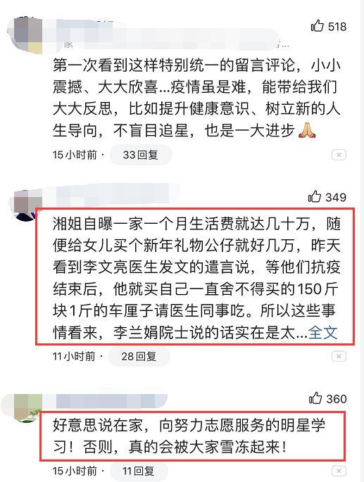 当然,李湘在这次无硝烟的战争中,这是代表一方面,那就是明星,网友出奇的默契,李兰娟这番话,可谓是厉害了,最终,以李湘关闭评论收场!