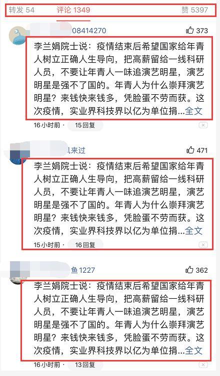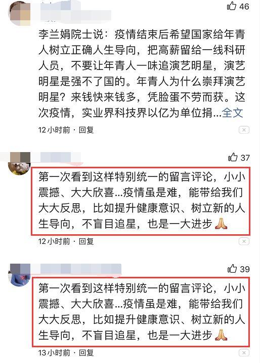 网友出奇一致的引用李兰娟教授说过的这番话“疫情结束后,国家应该要重新审视,要引导青少年正确的人生价值观……”,大概意思就是,国家要把钱,高薪酬,给与能够在国家危难之际,保护国家的科学家医学家等前线人员!