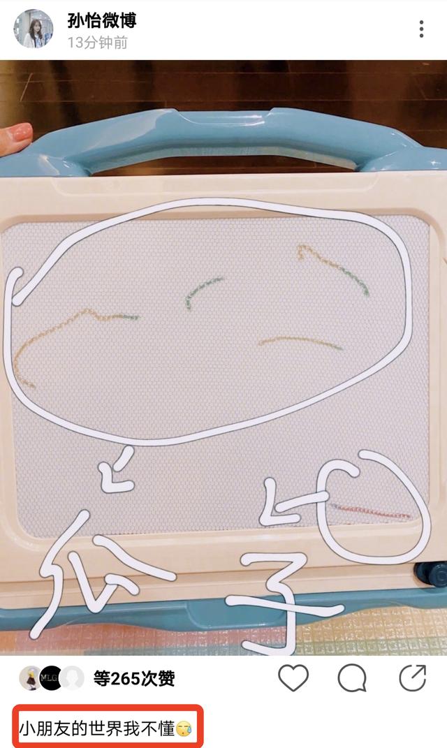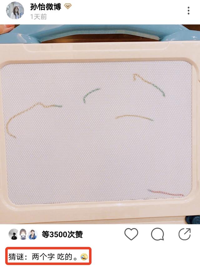2月9日,孙怡分享了女儿最近宅在家里的绘画作品,一个小画板上画了几根抽象的、弯弯曲曲的线条,还附文让大家猜谜,打一种吃的,而且是两个字。