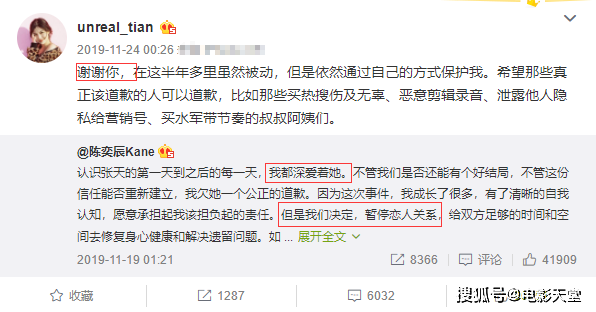 说来也玄幻,两个人当时因为感情的事情已经在互相揭短,理应宣告破裂了,但是最后还又都特别深情的为对方写上了“分手感言”,陈奕辰说“我深爱着他”,张天回“谢谢你”,两人一唱一和的迷之操作也是看的网友云里雾里。