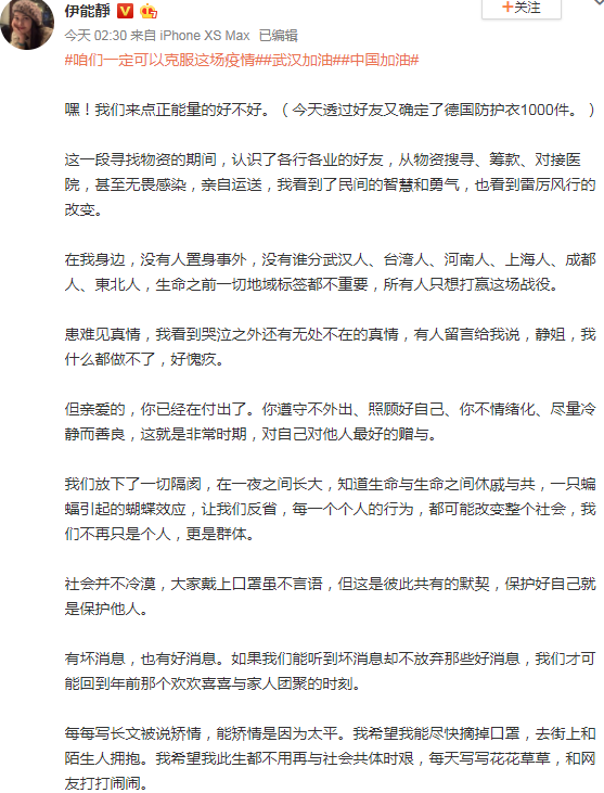 不仅如此,伊能静本人也是拍视频为武汉加油,同样也手写加油为武汉加油。当然,伊能静本人也是前后陆续给武汉一些医院捐款捐物,比如新捐的1000件德国防护衣将送到武汉某医院的医护人员手中。
