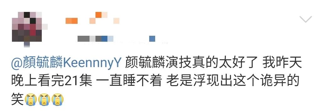 有网友也表示颜毓麟演技太好了,看完21集后颜毓麟嘴角诡异的笑一直浮现在脑海,都要睡不着了。